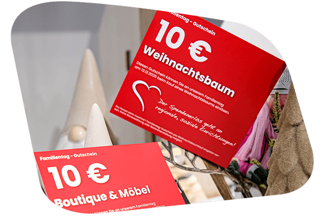 Gegen eine Spende in Höhe von 10 Euro zugunsten sozialer, regionaler Einrichtungen erhalten Sie 2 Familientag-Gutscheine im Gesamtwert von 20 Euro. Diese sind einlösbar beim Kauf eines Weihnachtsbaums (max. 1x 10 € Gutschein), beim Einkauf in unserer Boutique sowie beim Möbel-Shopping.
